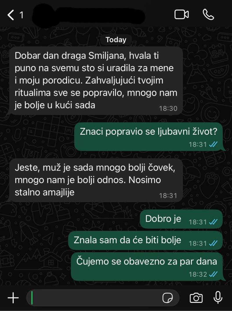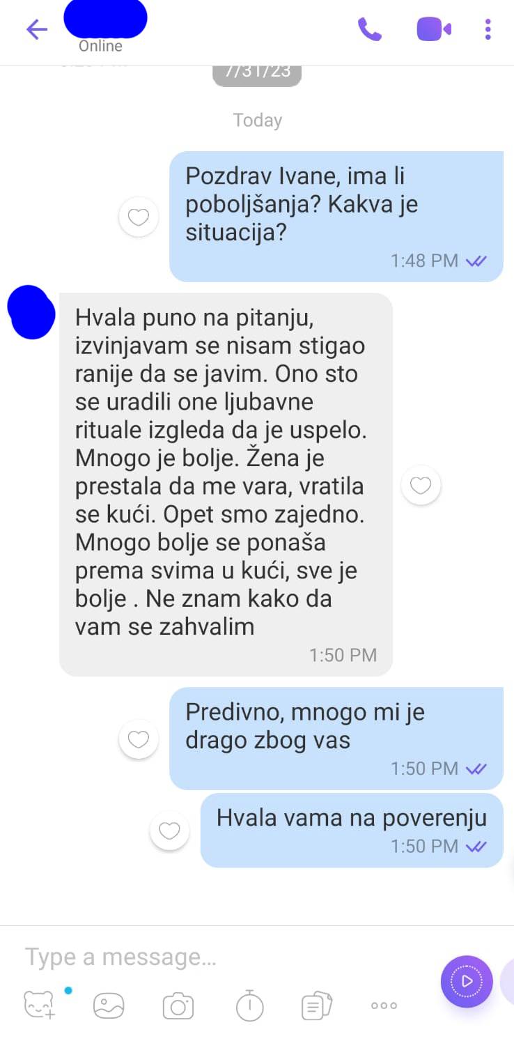 Imao sam problema sa devojkom, do te mere da su naši susreti prerasli u teške svađe. Iako sam je voleo i znao koliko je dobra u duši, to je jako dugo trajalo, postao sam zbog toga nesretan, jer bez nje nisam mogao, a sa njom je bilo nemoguće opstati. Onda sam jedan dan odlučio potražiti pomoć. Prijatelj mi je preporuči0 konsultacije s Vidovitom Smiljanom. Od tada se sve promenilo u mom životu i u mojoj ljubavnoj vezi. Hvala, Vidovitoj Smiljani.